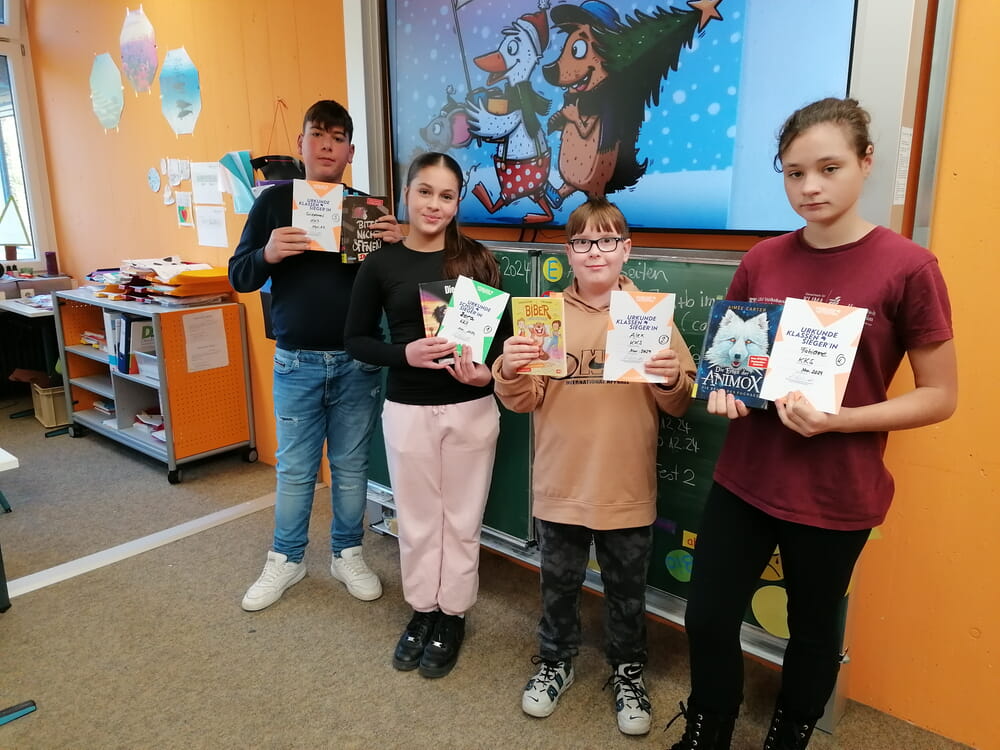 Wir gratulieren unserer Schulsiegerin Zara Ölmez! Am Freitag, den 29.11.2024, fand der Vorlesewettbewerb der 6. Klässler im Musiksaal statt. Wie bereits im Vorjahr lieferte sich die Schülerinnen und Schüler einen spannenden Wettbewerb. Die Klasse 5 war unter der Zuhörerschaft und verfolgte die beiden Lesedurchgänge bekannter und unbekannter Lesetexte mit Interesse. Unsere Jury aus Vertretern der Stadt und Mediothek (Herrn Esenwein, Frau Fink), der Schulleitung (Herrn Essig und Herrn Haba) und den Schülersprechern (Alex und Irem) machte sich die Entscheidung nicht leicht. Denn auch Alex Muntean, Fabienne Dobelmann und Giovanni Greco schlugen sich tapfer. Letztlich konnte Zara die Jury mit ihrer Vorleseleistung aus der Reihe der drei Ausrufezeichen und dem Fremdtext „Gespensterjäger auf eisiger Spur“ überzeugen. Als Schulsiegerin startet sie nun in die nächste Runde des Wettbewerbs – den Stadt- bzw. Kreisentscheid, welcher voraussichtlich im Februar 2025 stattfinden wird. Wir drücken ihr dafür die Daumen!!!