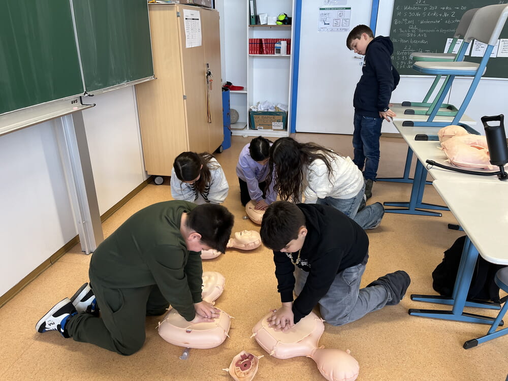 In unserer Schulsanitätsdienst-AG engagieren sich Schülerinnen und Schüler freiwillig und treffen sich einmal pro Woche zu einer gemeinsamen AG-Stunde. Dort lernen sie, wie man in Notsituationen schnell, richtig und kompetent Erste Hilfe leistet.